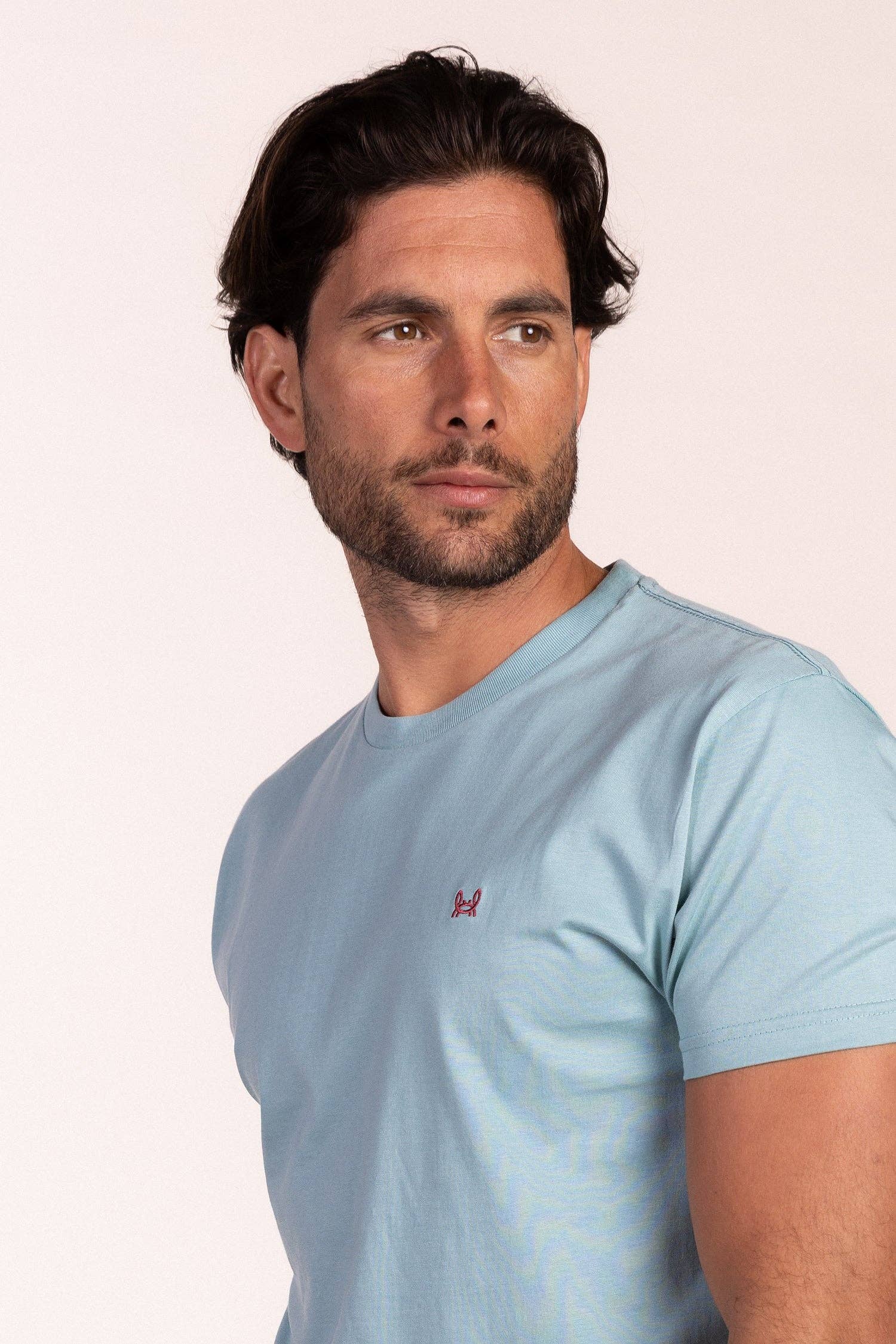Basis T-shirt van de kleine krab in aquablauw, gemaakt van 100% katoen. Het heeft een ronde hals en geribbelde afwerkingen aan de hals en mouwuiteinden. Contrasterend geborduurd logo van de kleine krab op de borst. Detail in de hals in de kleur van het borduurwerk.