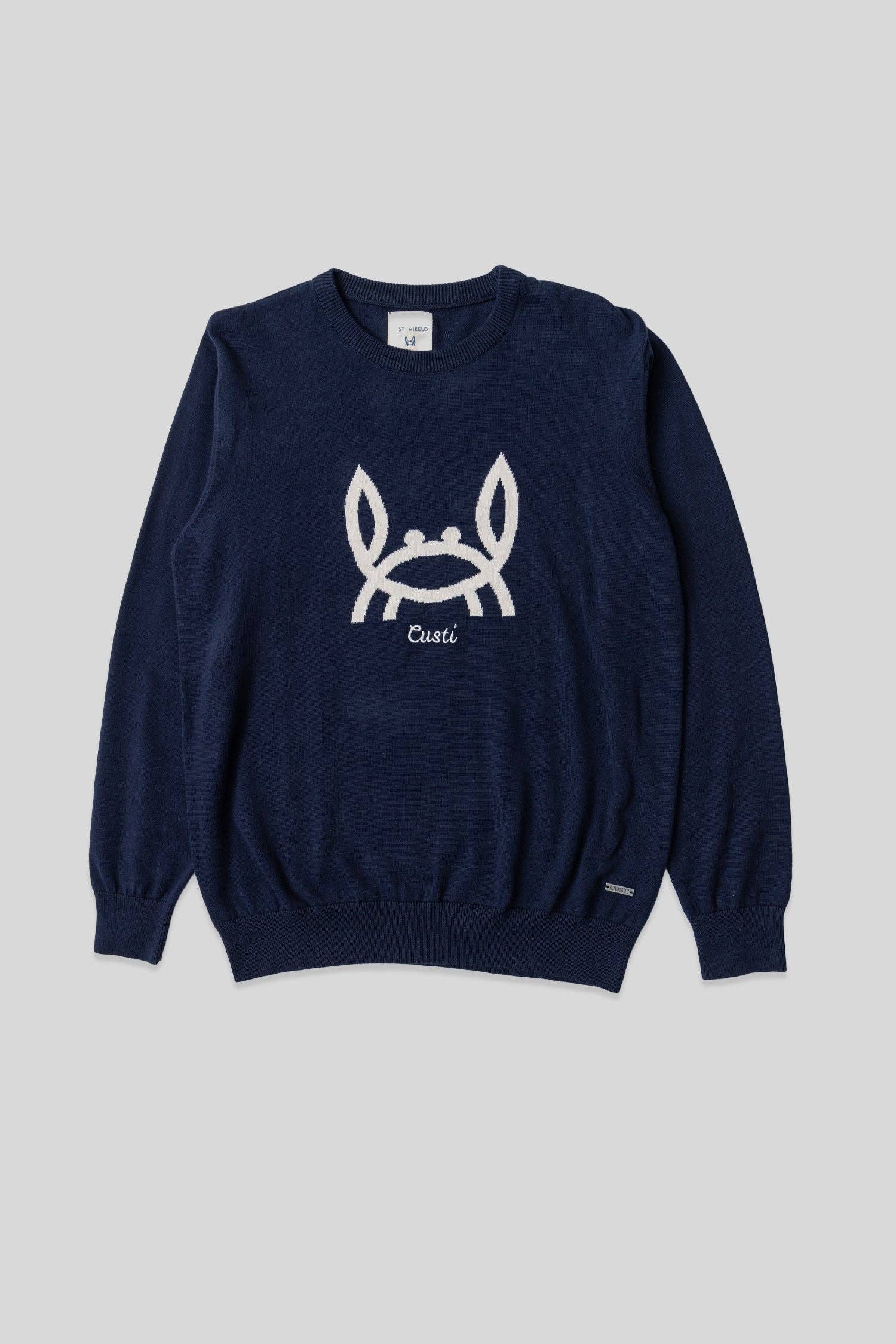 Marineblauwe intarsia trui van 100% katoen, met een exclusief ontwerp dat comfort en stijl combineert. Het valt op door het intarsia geweven krabmotief aan de voorkant samen met de inscriptie CUSTI, wat een uniek en herkenbaar karakter aan het kledingstuk geeft. De klassieke ronde hals, de Regular fit snit en de geribbelde afwerkingen aan de manchetten, hals en zoom zorgen voor een comfortabele en duurzame pasvorm. Dankzij de natuurlijke katoenen constructie biedt het zachtheid, ademend vermogen en lichtheid, waardoor het een onmisbare basic wordt voor casual looks met een onderscheidende touch.